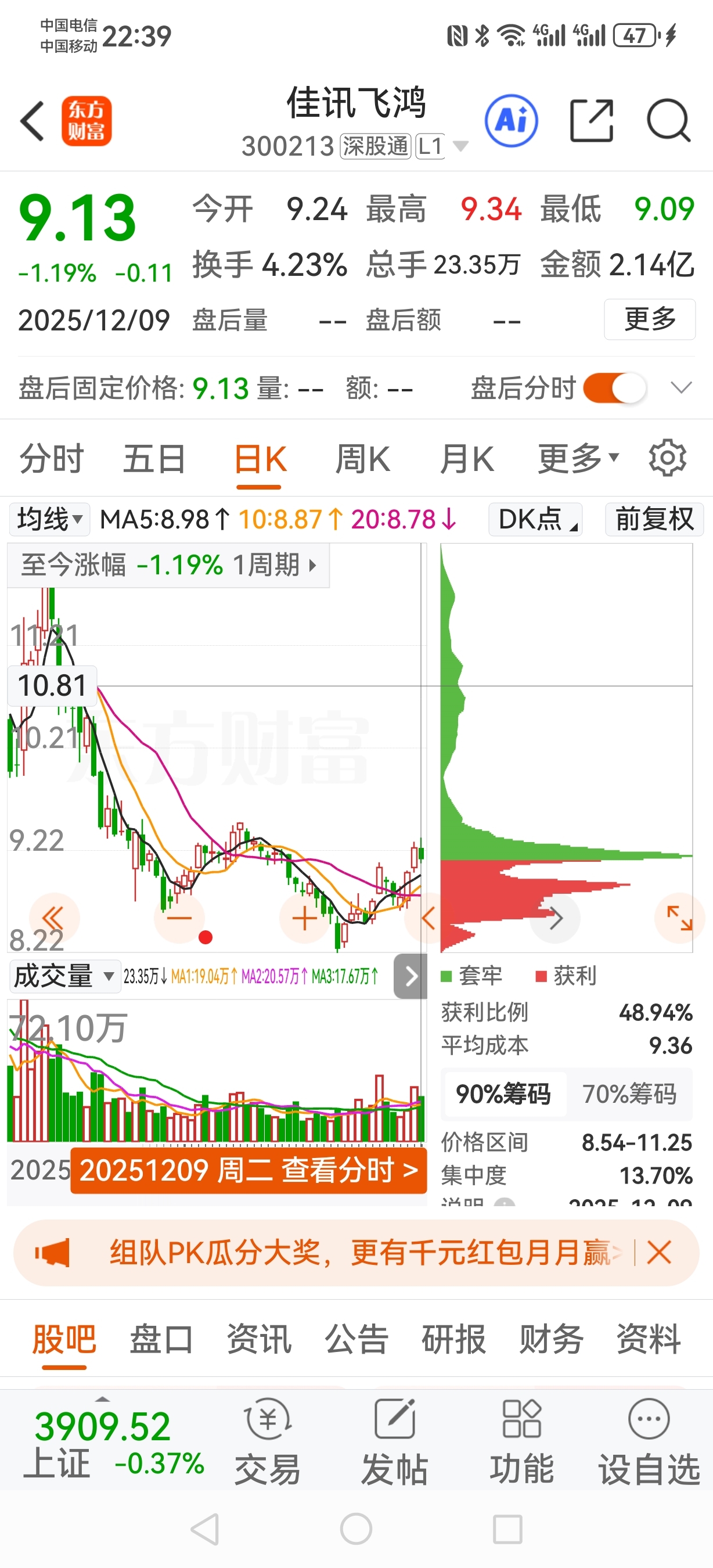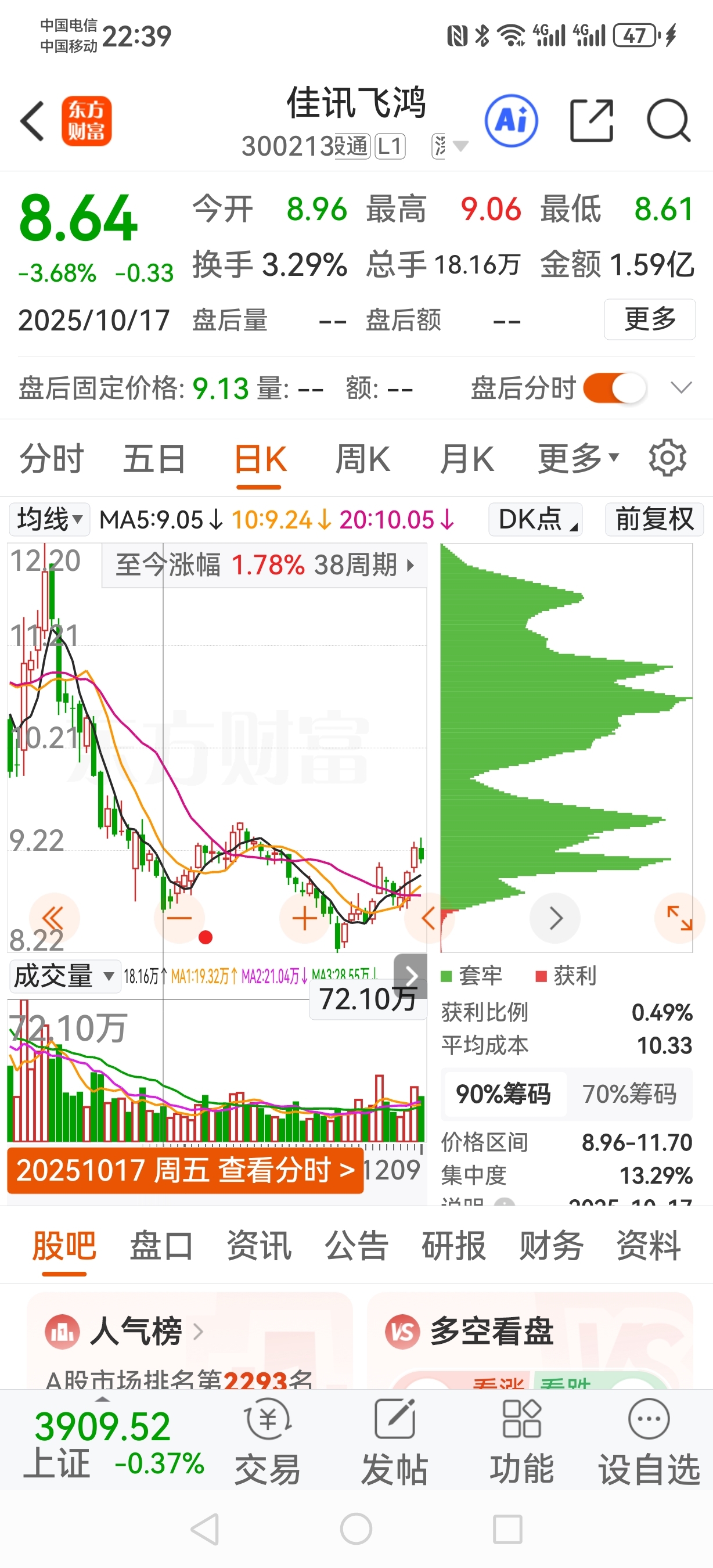 $佳讯飞鸿(SZ300213)$ 看看筹码峰就明白了,现在只需要半个涨停基本就没套牢盘了,前期高点套牢的筹码都已经割肉了。看看第一张,高点回落,上面全是套牢盘。