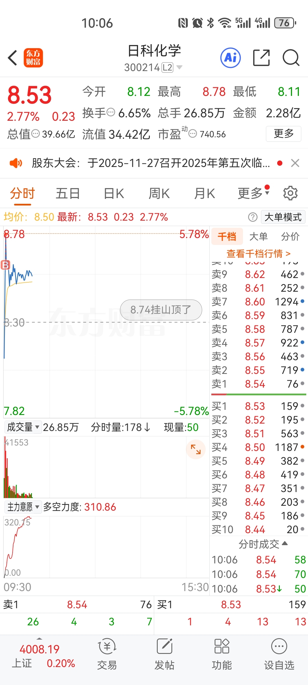 $日科化学(SZ300214)$ 8.74挂山顶了