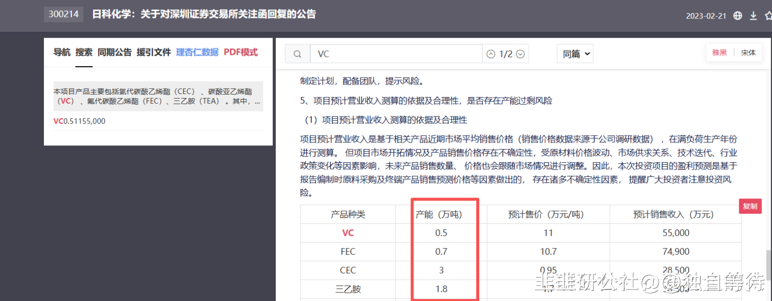 日科化学并表的子公司汇能达的VC和FEC产能是0.5万吨和0.7万吨。也就是说日