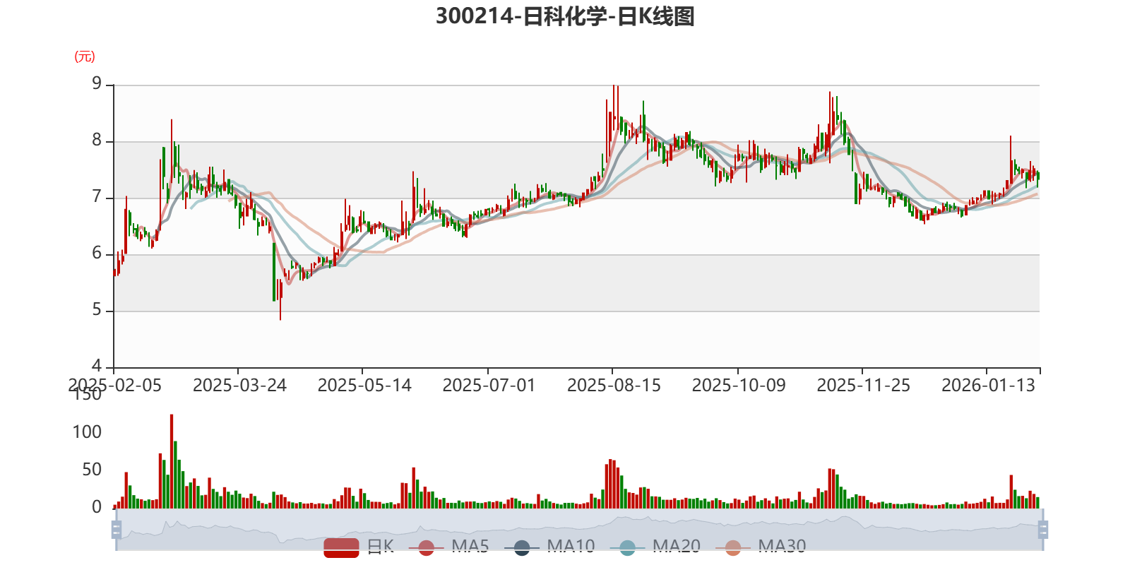 中证智能财讯日科化学(300214)1月30日晚间披露2025年度业绩预告,预计2025年实现营业收入37亿元至39亿元;归母净利润亏损1800万元至3000万元,上年同期亏损6816.12万元;扣非净利润亏损2400万元至3600万元,上年同期亏损7026.74万元。以最新收盘价计算,市净率(LF)约1.41倍,市销率(TTM)约0.9倍。