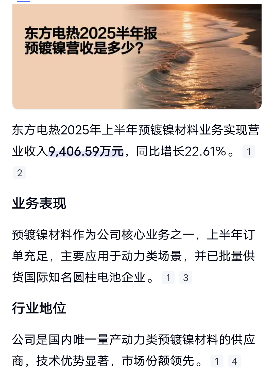 预镀镍材料2023全年营收只有4400万元,2024全年也只7600万元,2025上半年达到9400万元,根据公司互动平台说明,上半年预镀镍材料订单充足,业绩将在下半年体现,全年有望超2万吨,也就是说营收超4亿元,根据吨净利3000元测算,净利将超6000万。