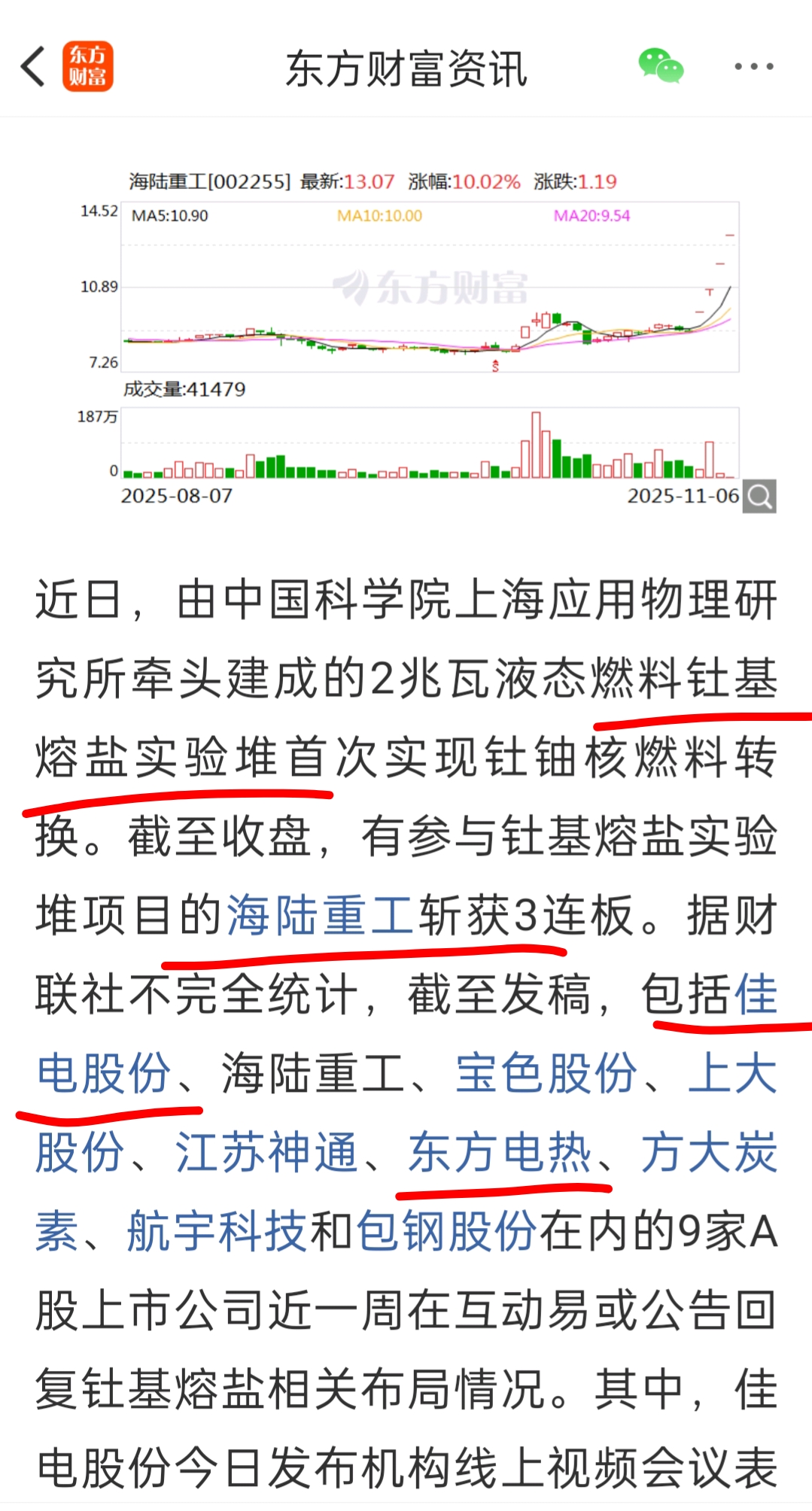 。钍基熔盐堆。最火的题材,和海陆重工。佳电股份。一样的题材,海陆重工,明天继续涨