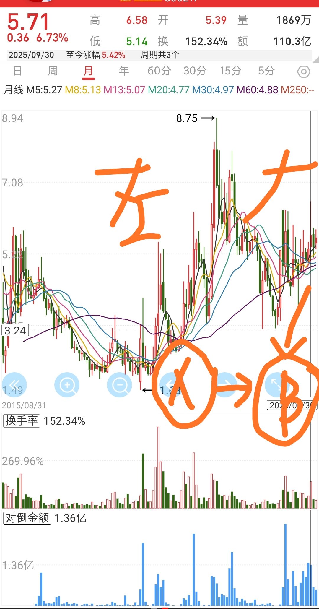 月线下跌趋势不容置疑,头肩顶,正在走完右肩,即将大杀!走出阶段低点B对应A!