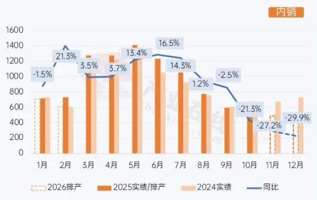 据产业在线最新发布的家用空调排产报告显示,2025年12月内销排产516万台,同比下滑29.9%。