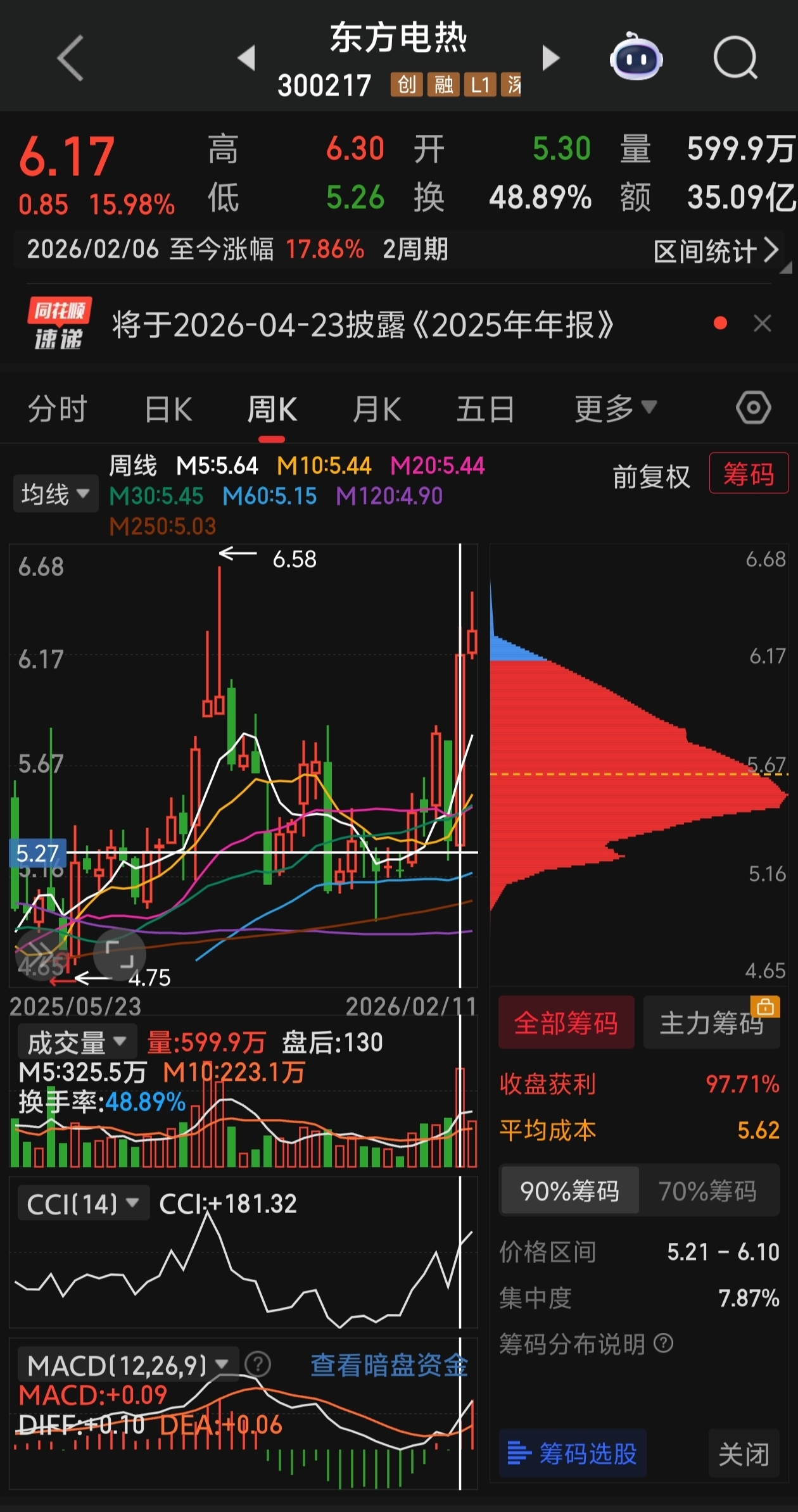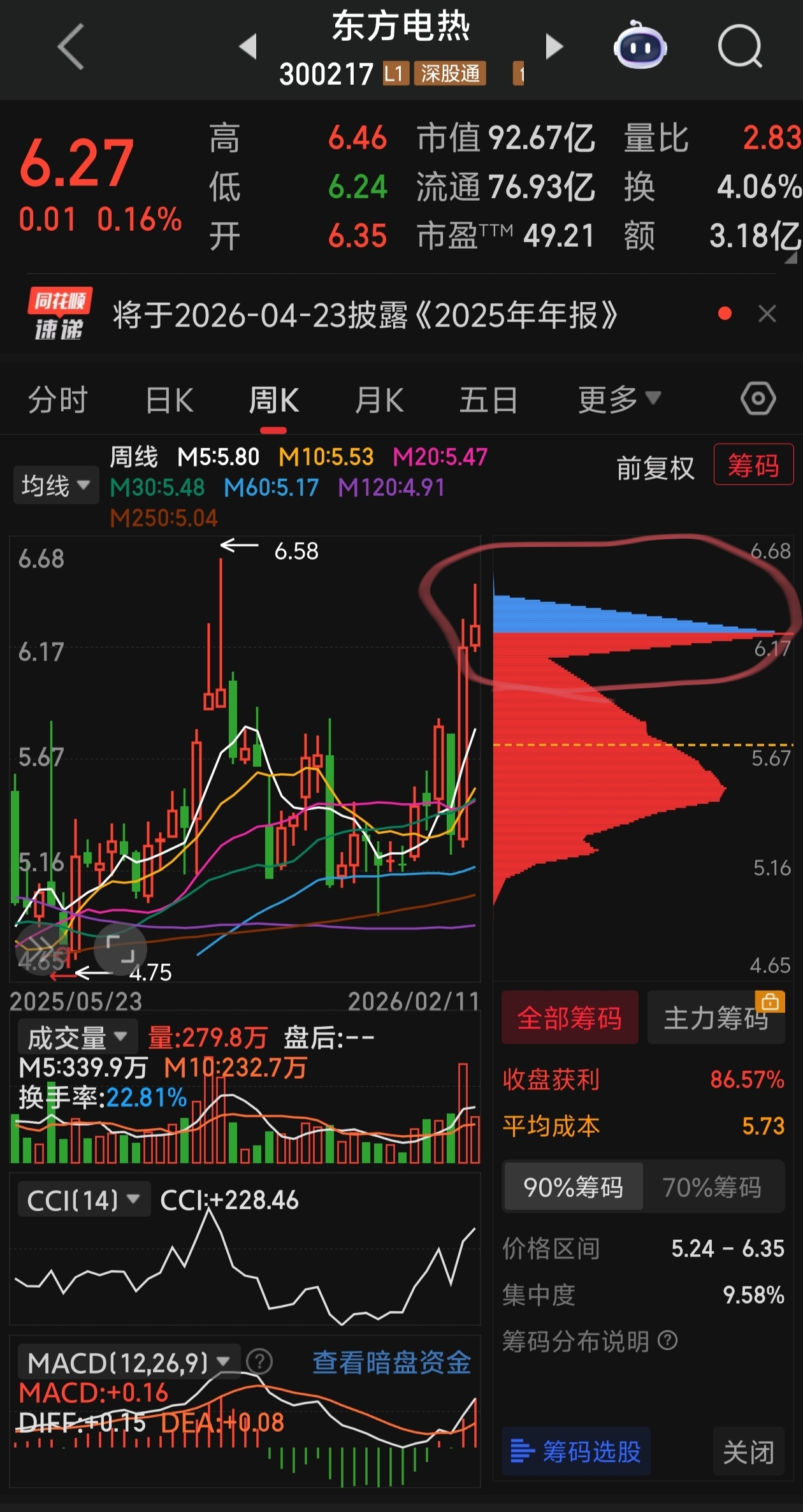 这周比上周高位筹码多出那么大一尖峰,接的散户太多了,所以压力太大了上不去吧,每上