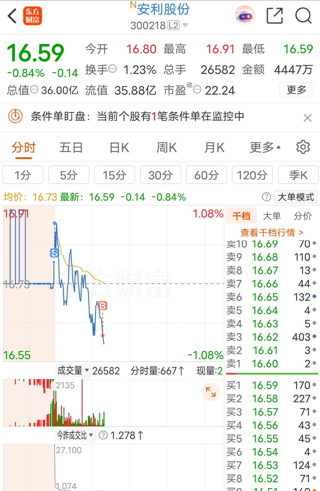 $安利股份(SZ300218)$ 看他一个小时比较抗跌,且没有量砸盘,就又买了。一买,又砸起来了