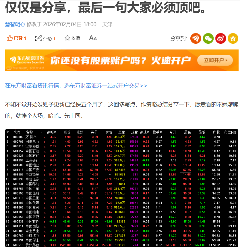 温馨提示: 1.根据《证券法》规定,禁止编造、传播虚假信息或者误导性信息,扰乱证券市场;2.用户在本社区发表的所有资料、言论等仅代表个人观点,与本网站立场无关,不对您构成任何投资建议。用户应基于自己的独立判断,自行决定证券投资并承担相应风险。《东方财富社区管理规定》