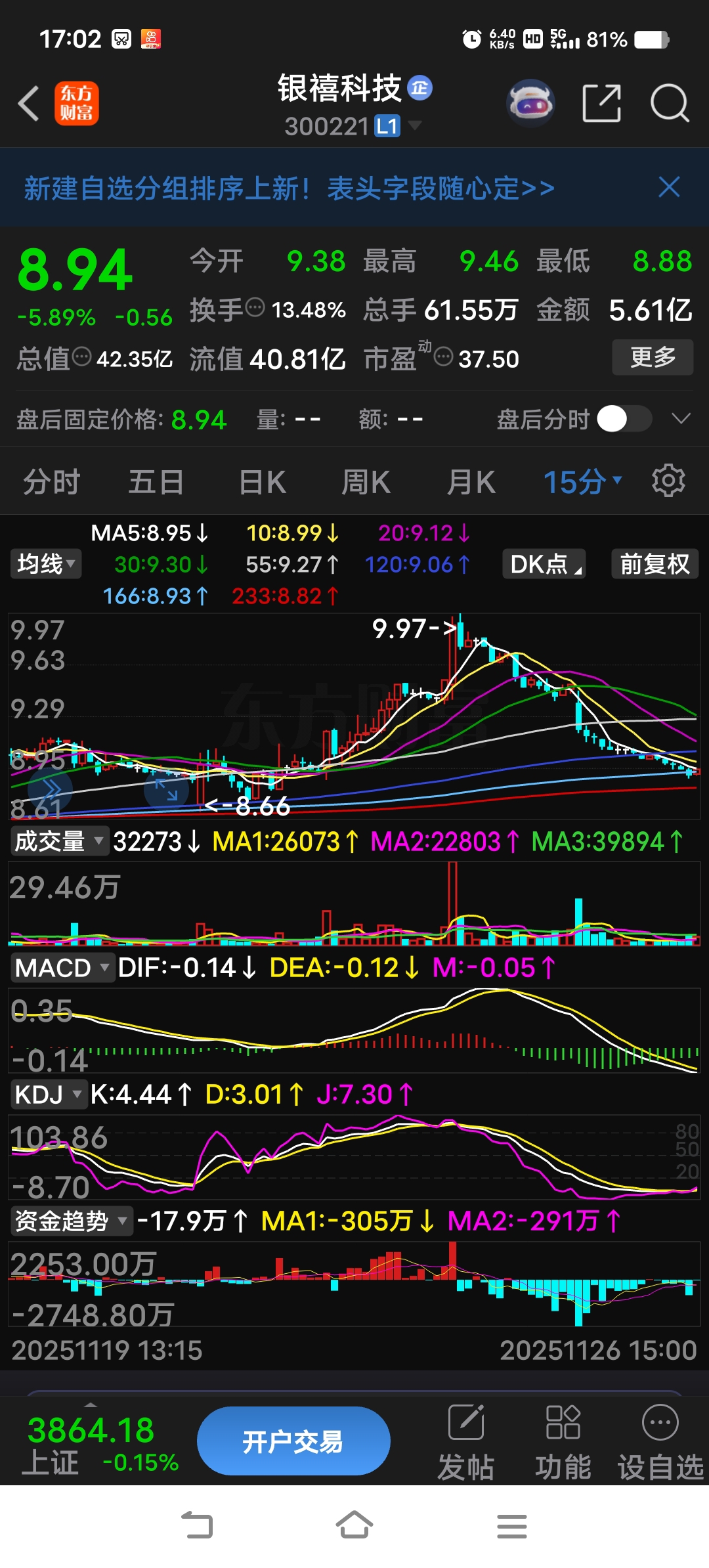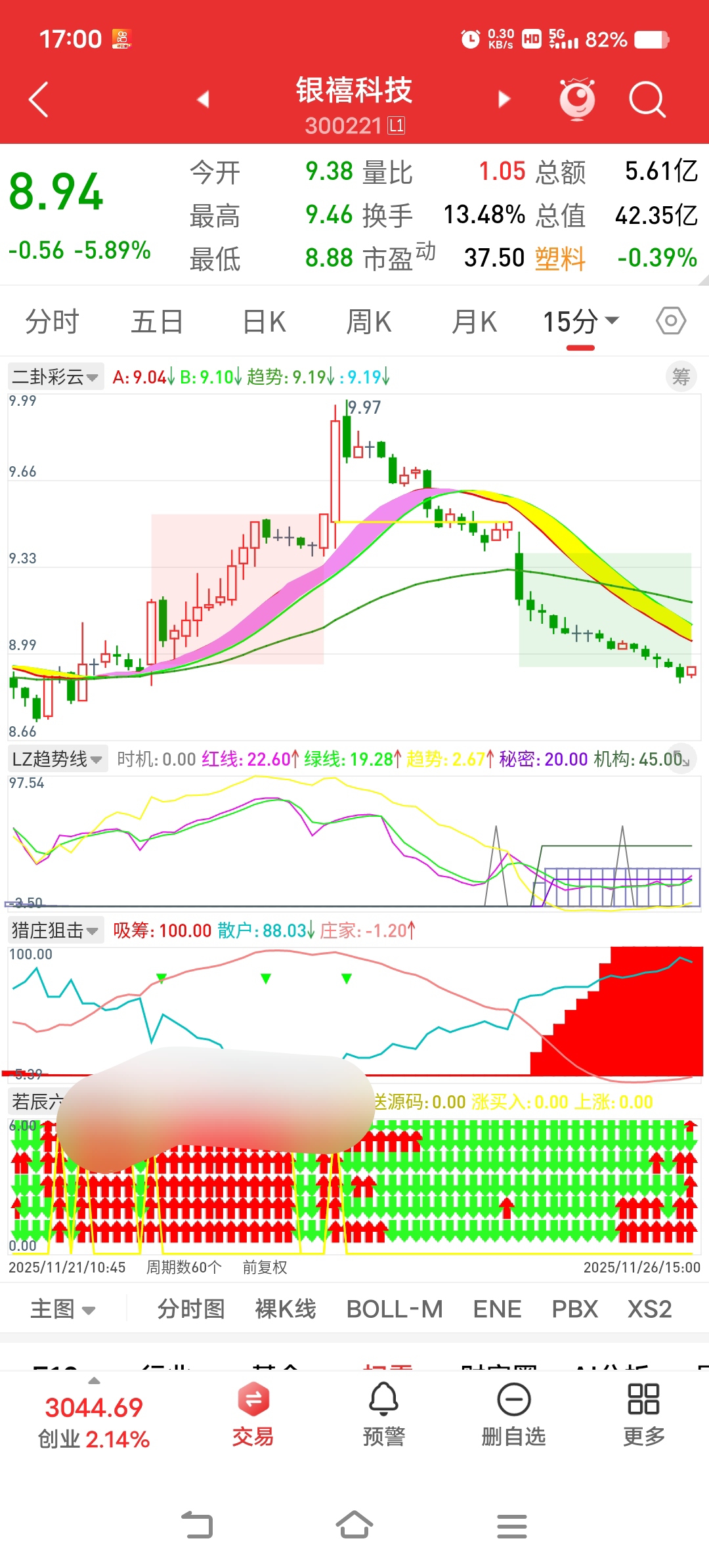 $银禧科技(SZ300221)$ 银禧科技,基本面良好,业绩大幅增长。经过前几天放量拉升后,今天从9.97元高点正好回撤到10月27日左右的8.86元平台位置,洗盘较彻底,又恰到好处。从15分钟分时线来看,银禧明天将依托10日线8.96元支撑继续上攻,挑战前高。别问什么原因?因为成交量摆在这里,拭目以待吧