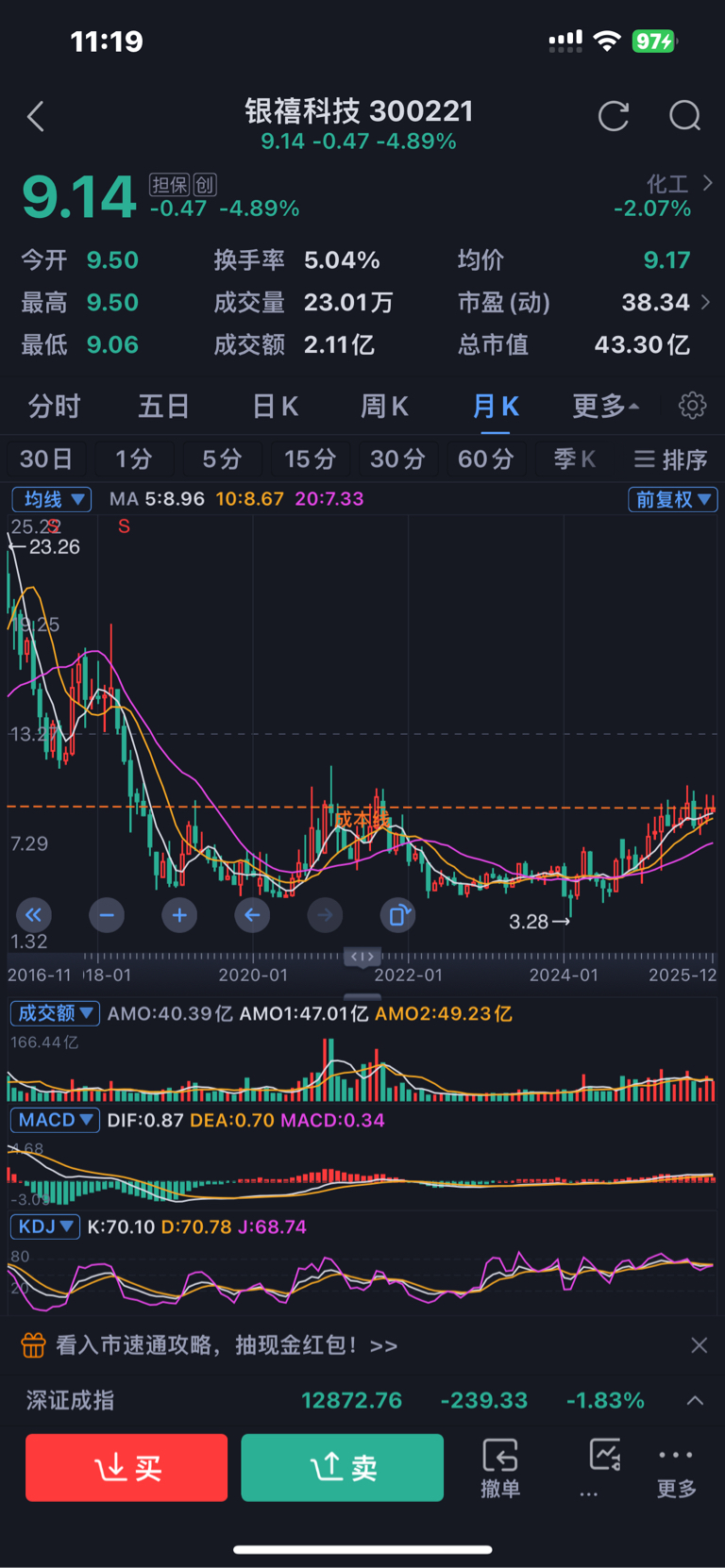 $银禧科技(SZ300221)$ 我昨天9.64清仓了,今天买早了,9.2接回来的,但是这个趋势还挺好的,应该会突破10块,甚至11,起码有业绩支撑不用太担心