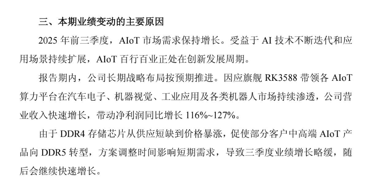 瑞芯微三季度利润环比下滑,影响原因居然是DDR4存储芯片从供应短缺到价格暴涨。