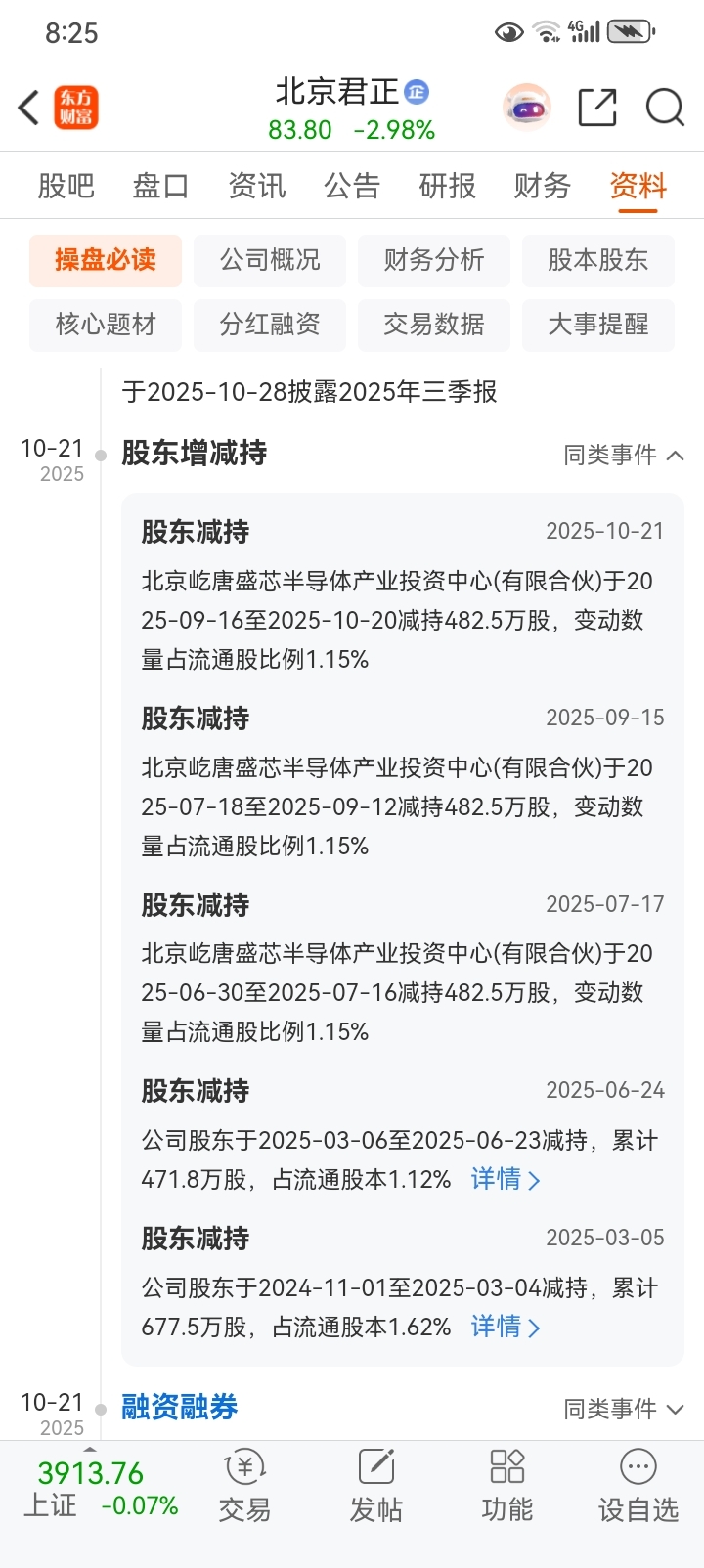 $北京君正(SZ300223)$ 沪深北三个市场独一无二的坑人股,该股某一大股东居然从去年11月1日起到现在几乎天天都在减持套现,买了它真是眼瞎啊