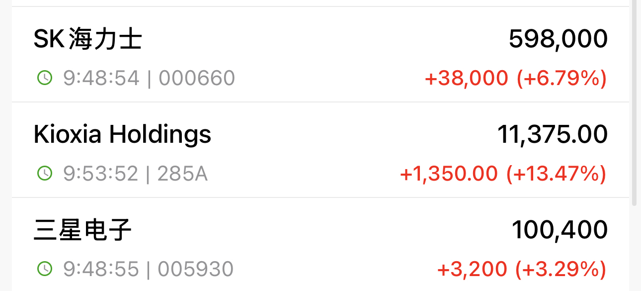 存储大周期来临,日本铠侠和韩国三星海力士强势大涨,今晚美光估计也是大涨