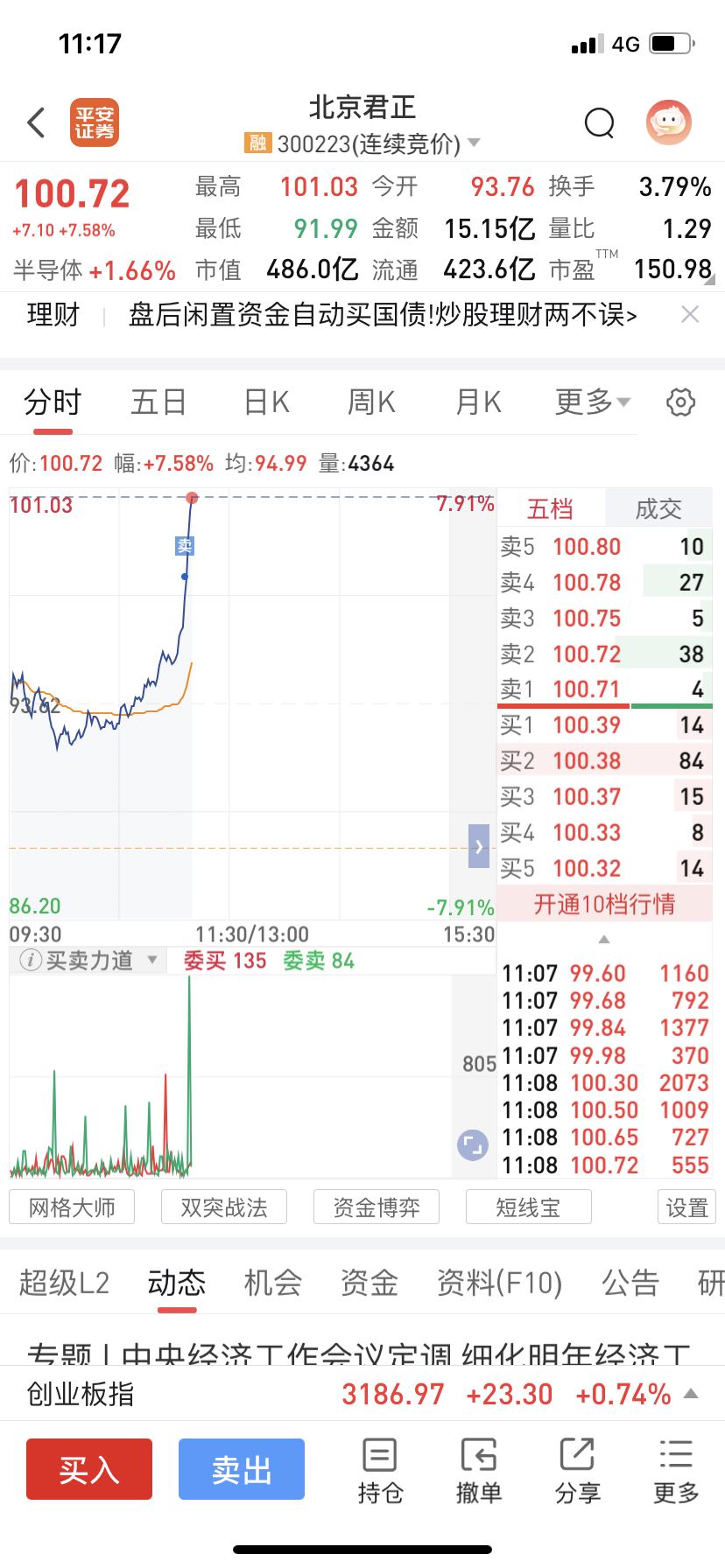 $北京君正(SZ300223)$ 挂了98,没想到成交了,气死了。