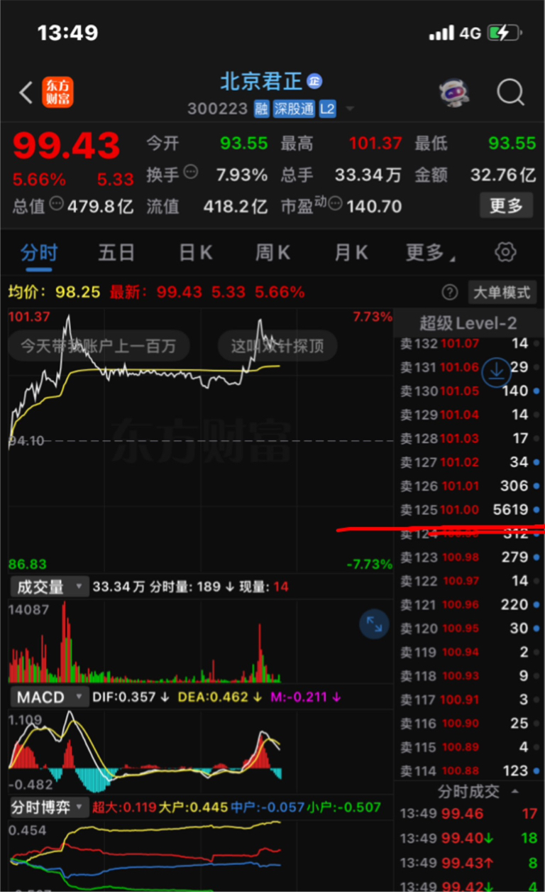 $北京君正(SZ300223)$ 101这个价位五千多收卖单,都还没碰到就掉下来了!