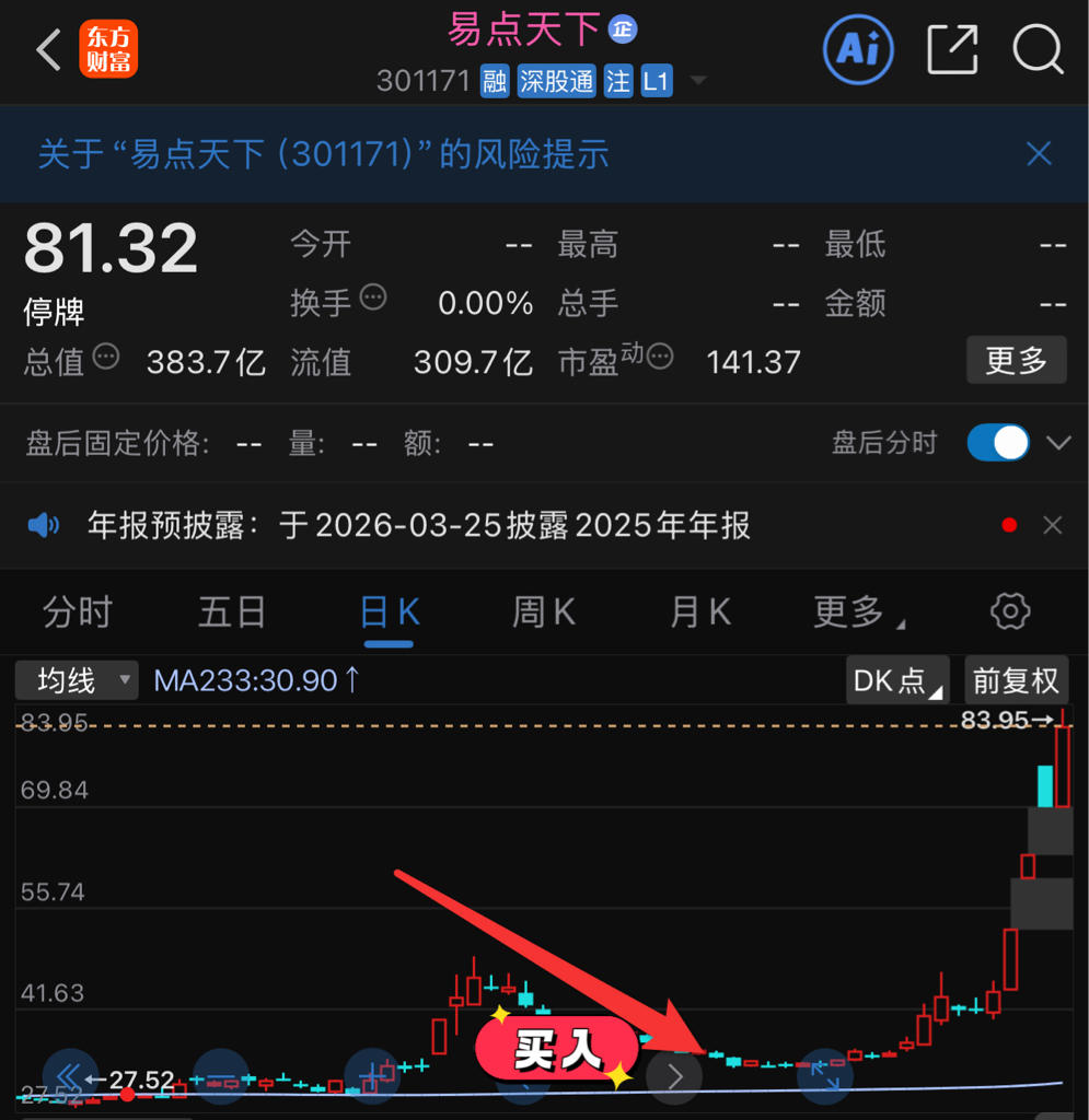A股降温导致易点天下停牌,但是蓝色光标补跌了30%,如果易点天下开盘之前光标涨回来了呢?可能是另一个故事,看这双大手能护多久。整体看这只票一个月内已经是实打实的翻倍了,即使开盘补跌又何妨?他威胁不到咱们37的成本。
