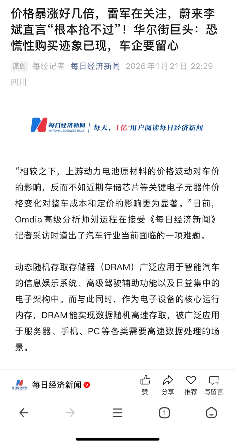 $北京君正(SZ300223)$ 相较之下,上游动力电池原材料的价格波动对车价的影响,反而不如近期存储芯片等关键电子元器件价格变化对整车成本和定价的影响更为显著。