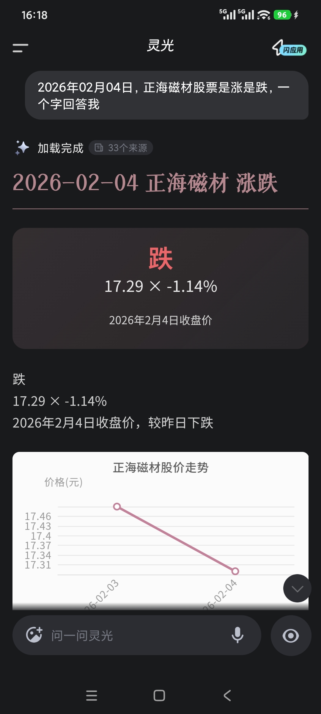 问了灵光,告诉我明天2026年02月04日,正海磁材股票下跌,跌幅-1.14%,