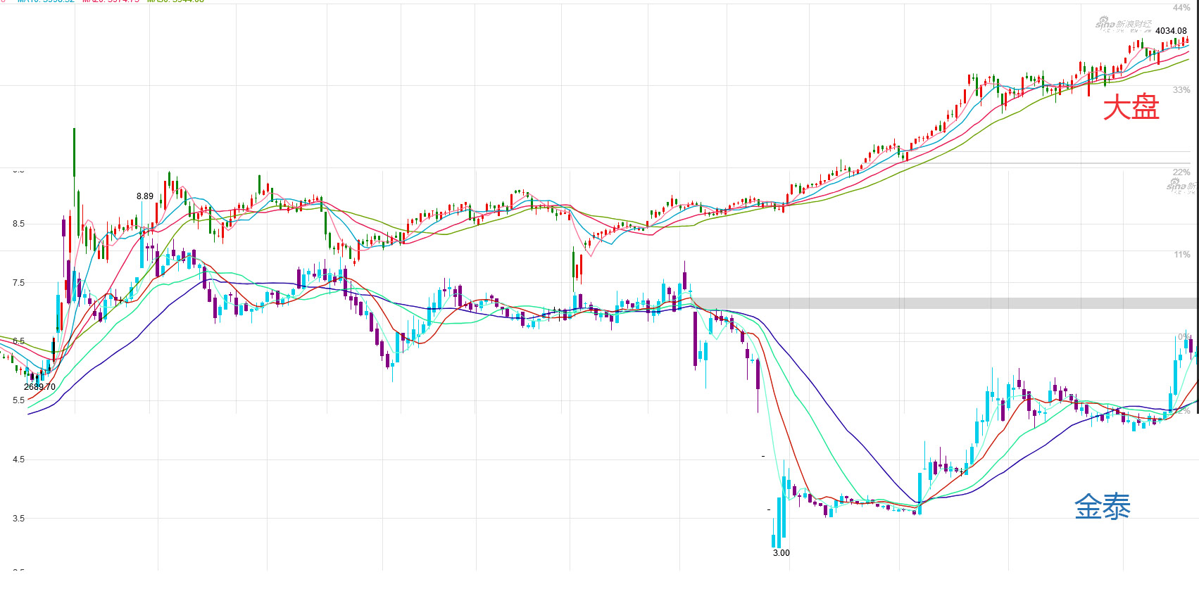 难道操盘手被我的金泰K线和大盘K线重叠对比图刺激到自尊了?要逆势大盘而上表现表现