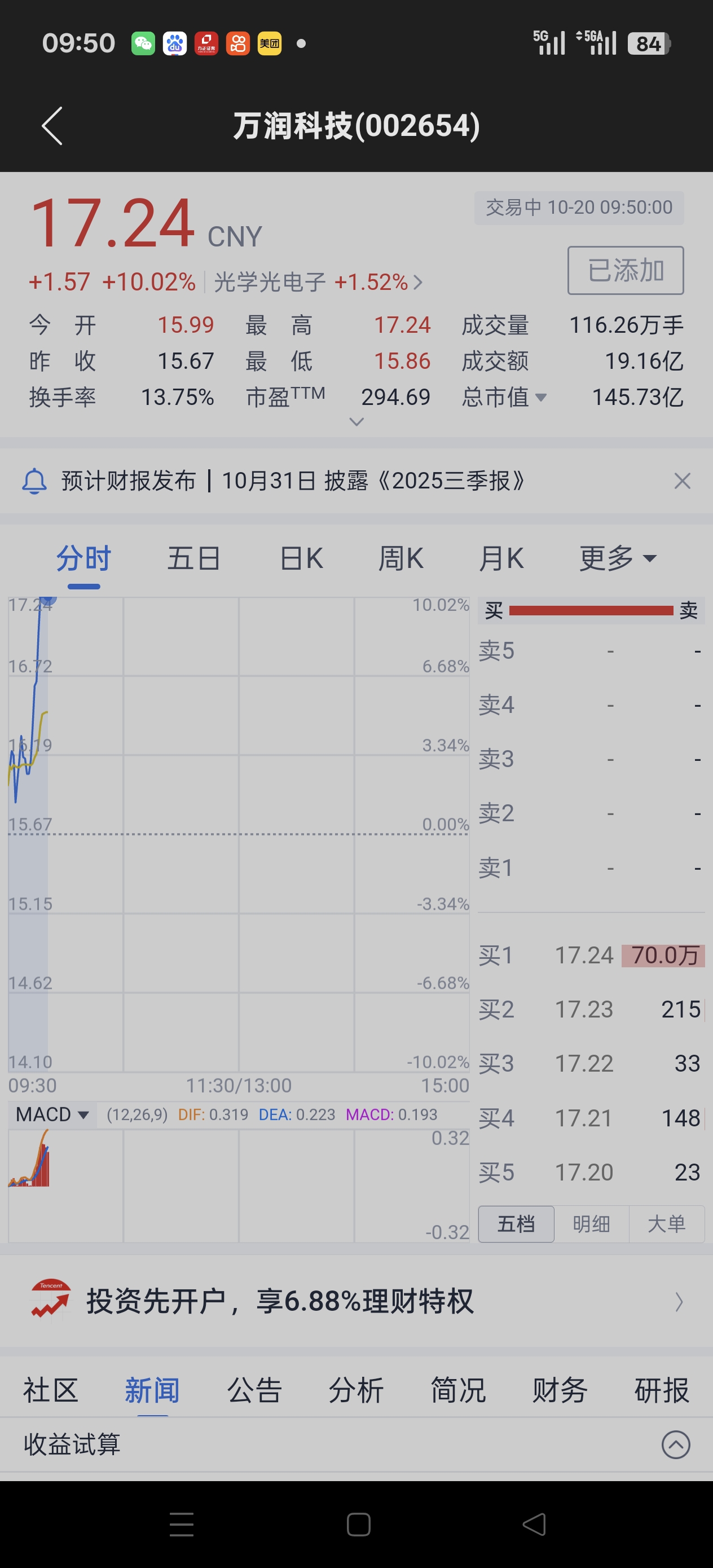 还好今天我的万润科技涨停板