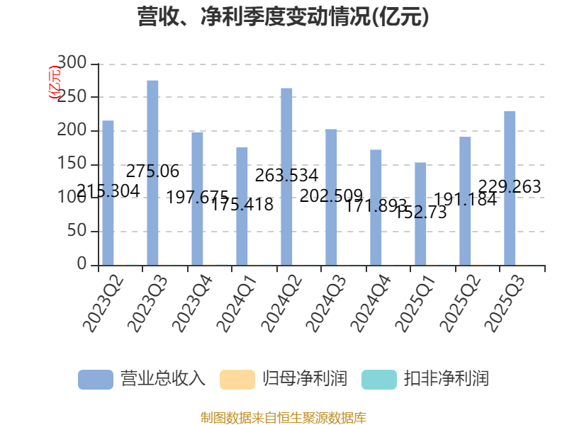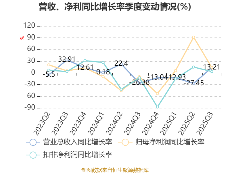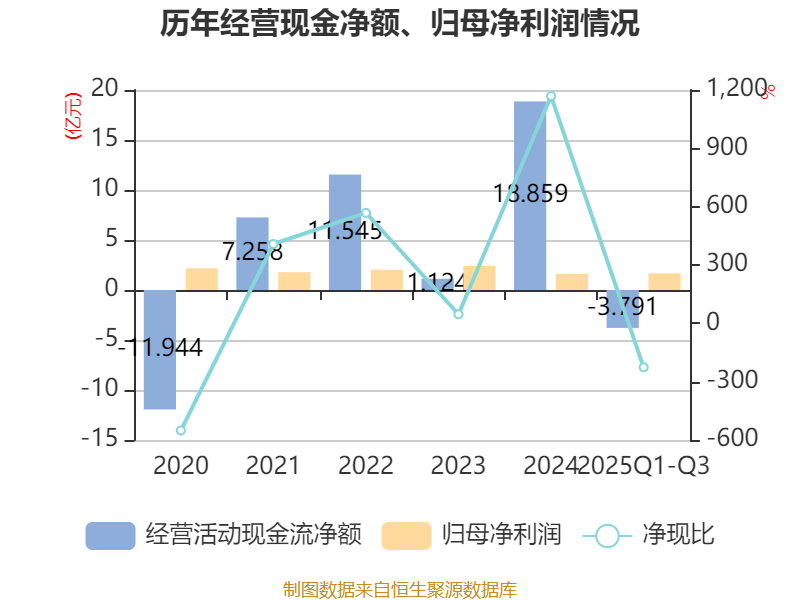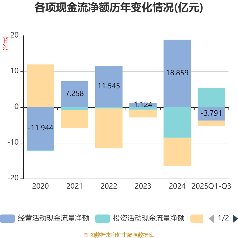 2025年前三季度,公司经营活动现金流净额为-3.79亿元,同比减少26.85亿元;筹资活动现金流净额-1.44亿元,同比增加5.83亿元;投资活动现金流净额5.29亿元,上年同期为-10.23亿元。