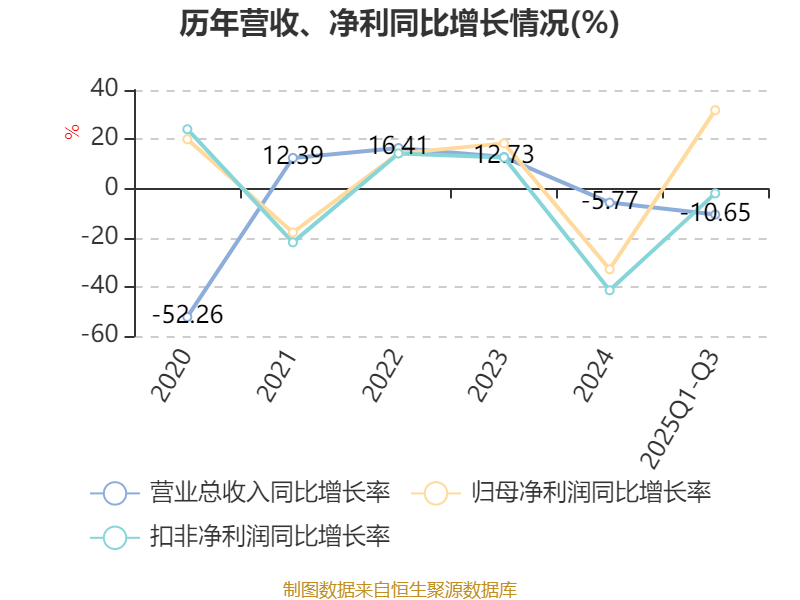 资产重大变化方面,截至2025年三季度末,公司货币资金较上年末增加60.11%,占公司总资产比重上升10.64个百分点;预付款项较上年末减少3.03%,占公司总资产比重下降5.77个百分点;应收票据及应收账款较上年末减少36.26%,占公司总资产比重下降2.94个百分点;交易性金融资产合计较上年末减少60.13%,占公司总资产比重下降2.86个百分点。