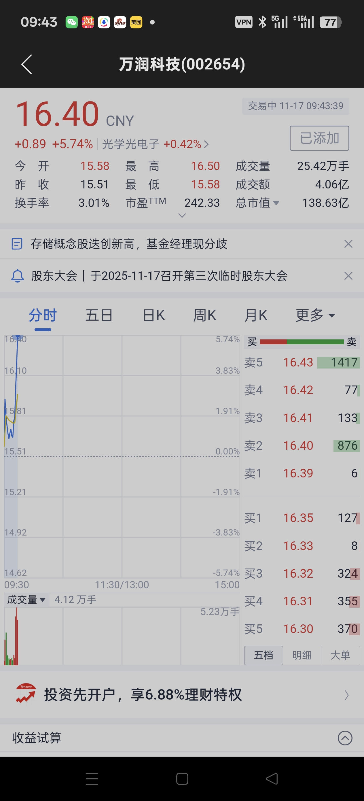 恭喜今天我的万润科技目前涨了5%,上周五低点补了一点。