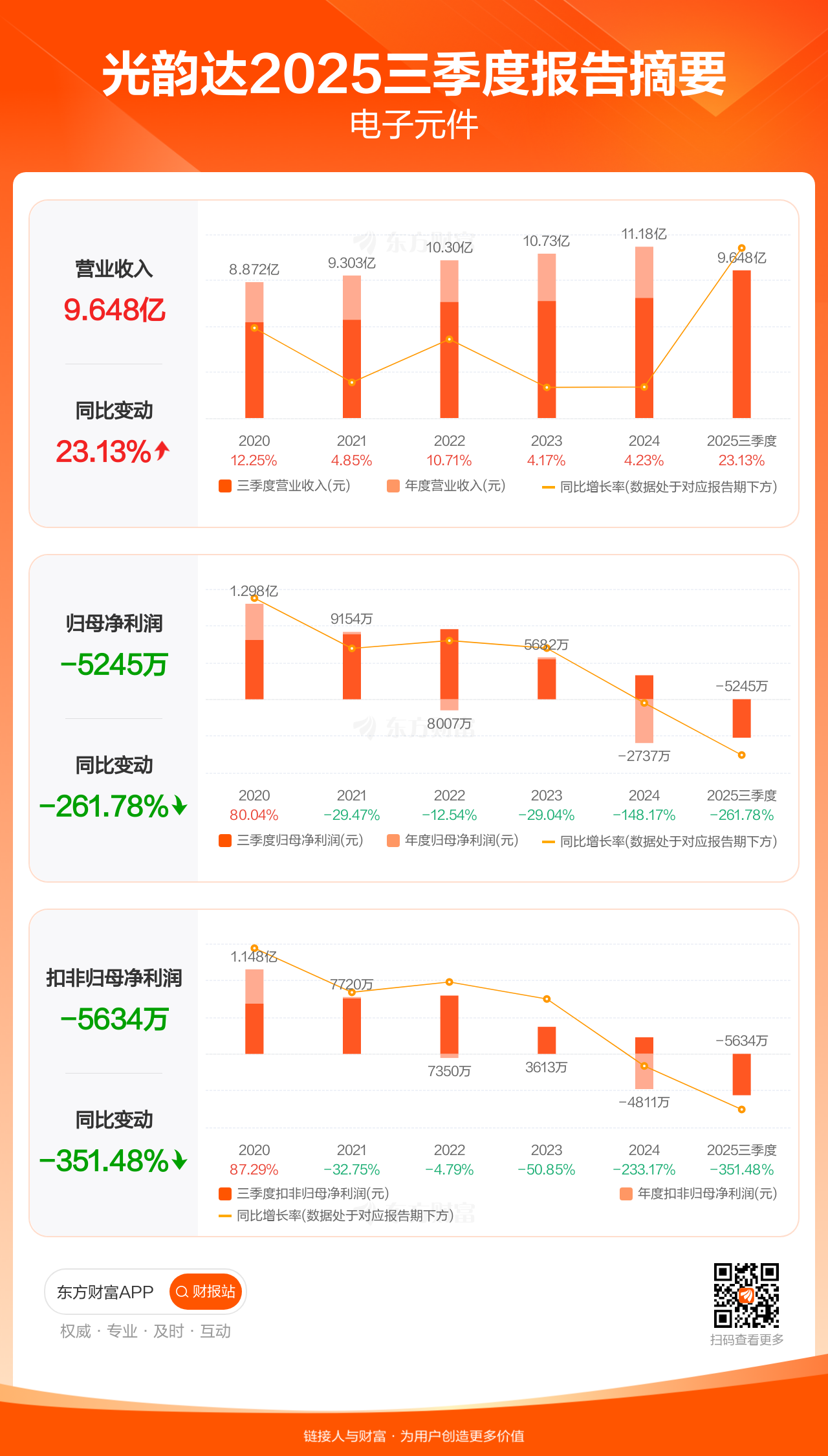 光韵达10月30日发布2025年三季报显示,公司前三季实现营业收入9.65亿元,同比增长23.13%;归母净利润-5244.84万元;扣非归母净利润-5633.85万元。