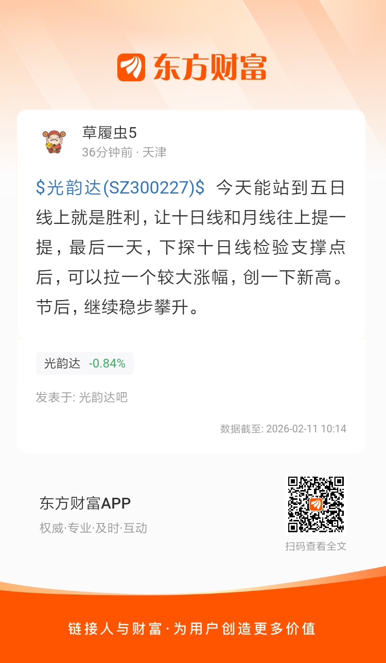 $光韵达(SZ300227)$ 今天能站到五日线上就是胜利,让十日线和月线往上提一提,最后一天,下探十日线检验支撑点后,可以拉一个较大涨幅,创一下新高。节后,继续稳步攀升。