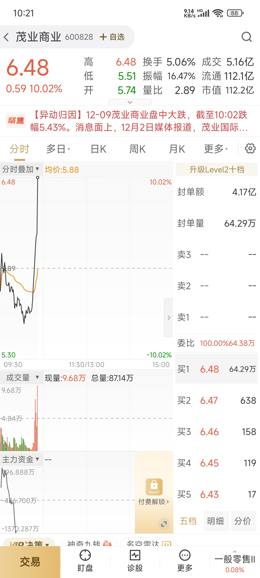 昨天盘后提示的茂业,今天早上绿六个多点直线拉涨停,算是小地天板了,四个多亿封单虽