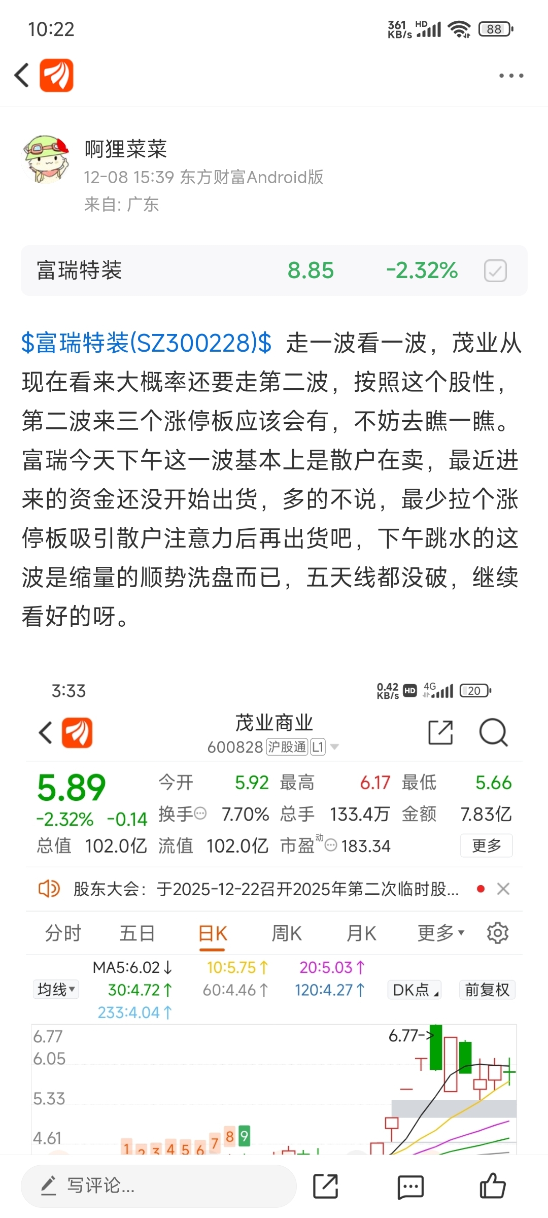 $富瑞特装(SZ300228)$ 昨天盘后提示的茂业,今天早上绿六个多点直线拉涨停,算是小地天板了,四个多亿封单虽然不多,但是直线拉小地天板的强度和态度是非常坚决的,恭喜老铁吃肉了,富瑞今天不好说,因为商业航天分歧,后排的正在淘汰赛,而昨天晚上说了昨天是人声鼎沸,那今天就要分歧。