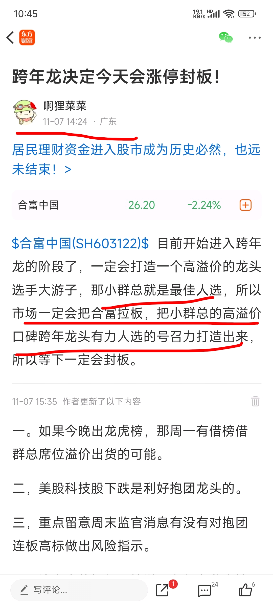 11月7号下午两点多合富大绿13块多股价的时候菜菜说市场需要小群总的席位溢价,小