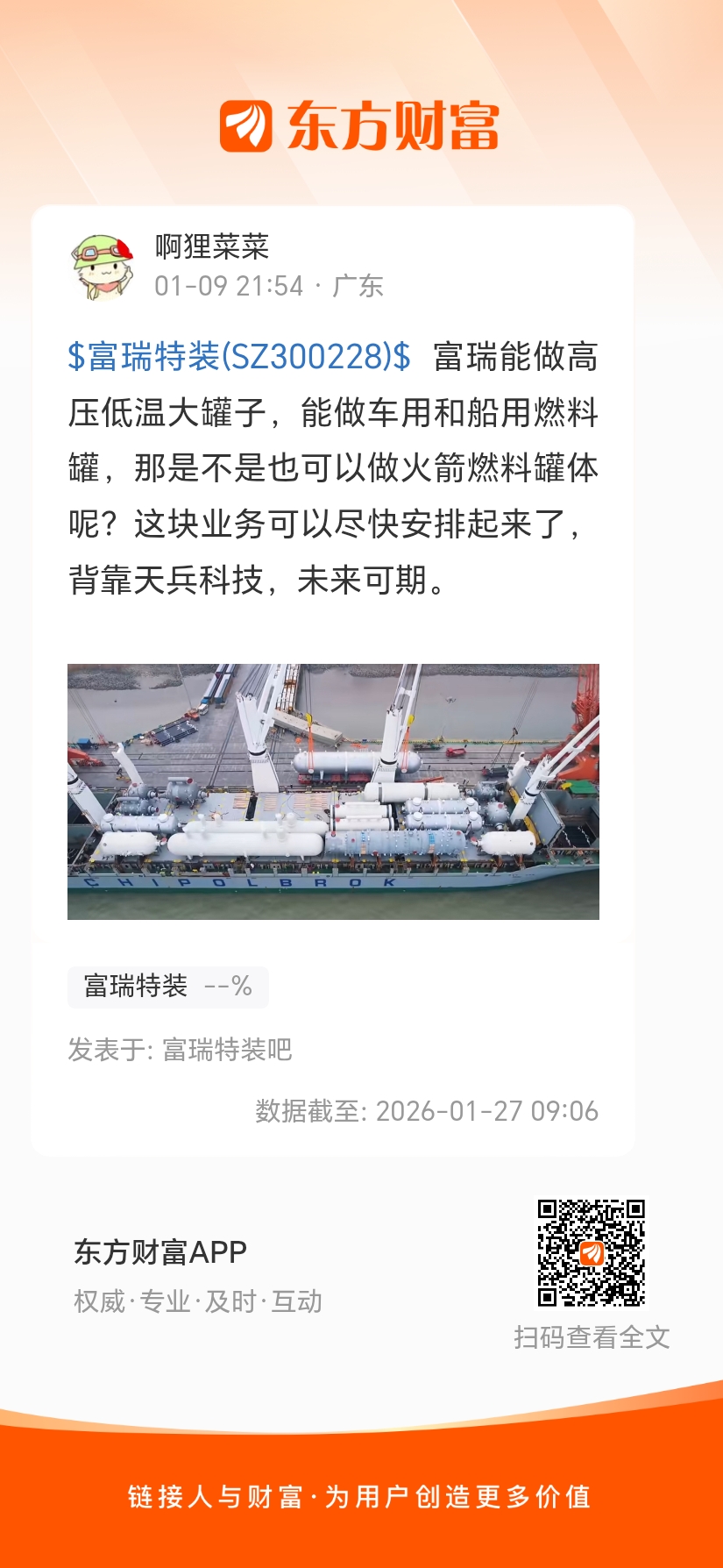 $富瑞特装(SZ300228)$ 富瑞能做高压低温大罐子,能做车用和船用燃料罐,那是不是也可以做火箭燃料罐体呢?这块业务可以尽快安排起来了,背靠天兵科技,未来可期。