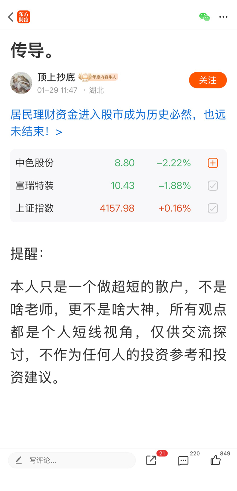 温馨提示: 1.根据《证券法》规定,禁止编造、传播虚假信息或者误导性信息,扰乱证券市场;2.用户在本社区发表的所有资料、言论等仅代表个人观点,与本网站立场无关,不对您构成任何投资建议。用户应基于自己的独立判断,自行决定证券投资并承担相应风险。《东方财富社区管理规定》