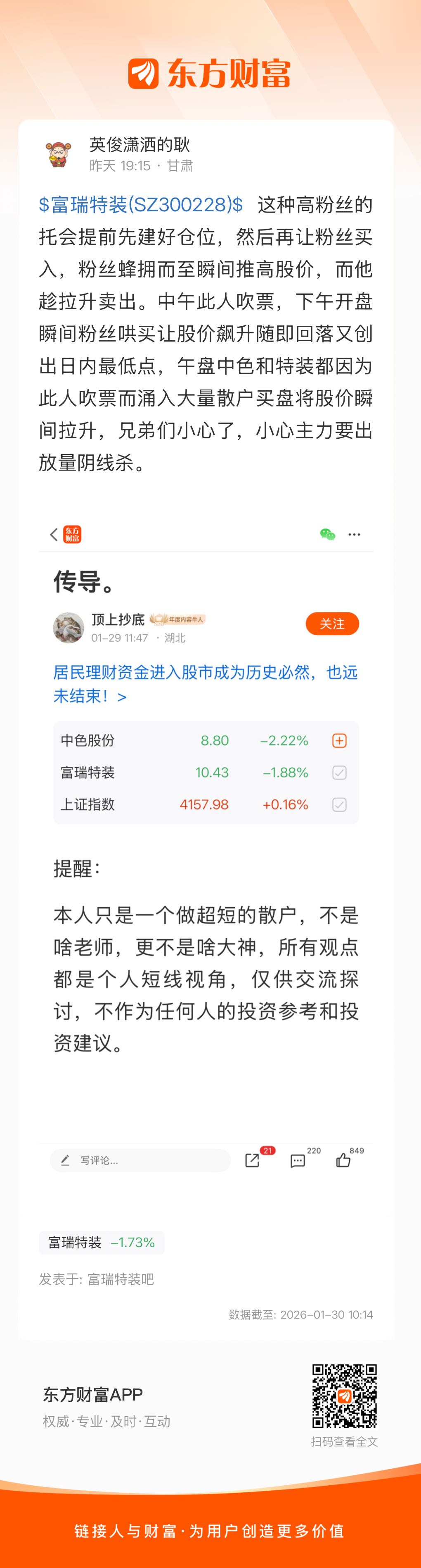 $富瑞特装(SZ300228)$ 这种高粉丝的托会提前先建好仓位,然后再让粉丝买入,粉丝蜂拥而至瞬间推高股价,而他趁拉升卖出。中午此人吹票,下午开盘瞬间粉丝哄买让股价飙升随即回落又创出日内最低点,午盘中色和特装都因为此人吹票而涌入大量散户买盘将股价瞬间拉升,兄弟们小心了,小心主力要出放量阴线杀。