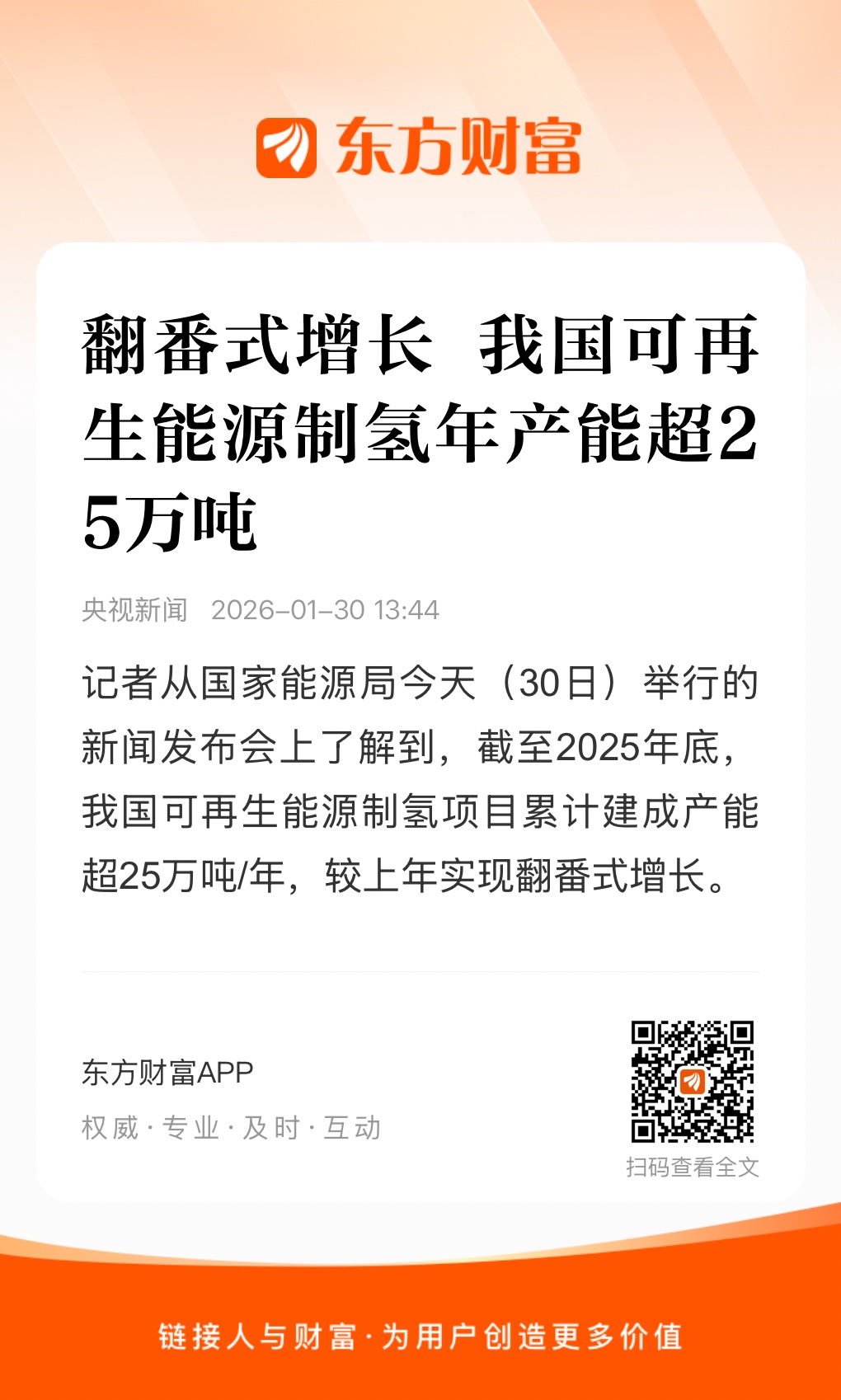 记者从国家能源局今天(30日)举行的新闻发布会上了解到,截至2025年底,我国可再生能源制氢项目累计建成产能超25万吨/年,较上年实现翻番式增长。