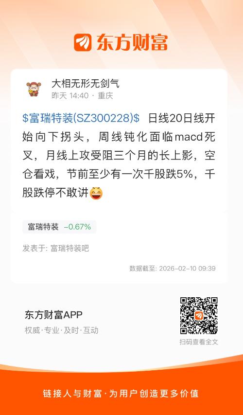 $富瑞特装(SZ300228)$ 日线20日线开始向下拐头,周线钝化面临macd死叉,月线上攻受阻三个月的长上影,空仓看戏,节前至少有一次千股跌5%,千股跌停不敢讲