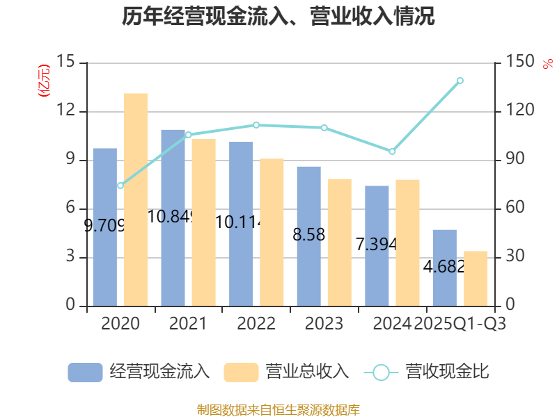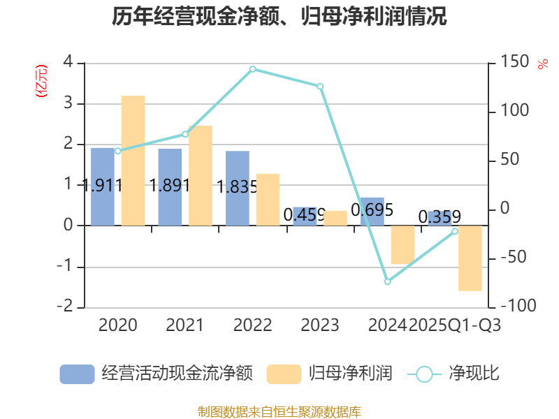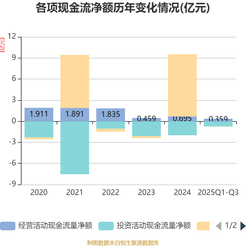 2025年前三季度,公司经营活动现金流净额为3586.35万元,同比增加3972.41万元;筹资活动现金流净额-265.78万元,同比增加302.56万元;投资活动现金流净额-7435.26万元,上年同期为-4096.89万元。
