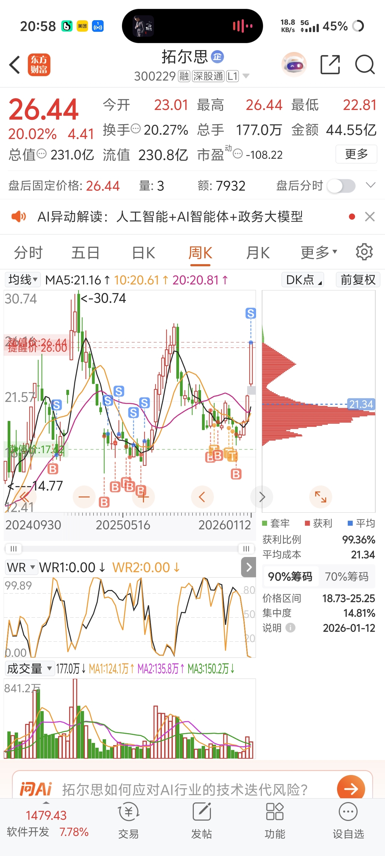 拍断大腿了,感觉至少能突破28,涨得让人恐惧,算了,成本不到20,26.43成交