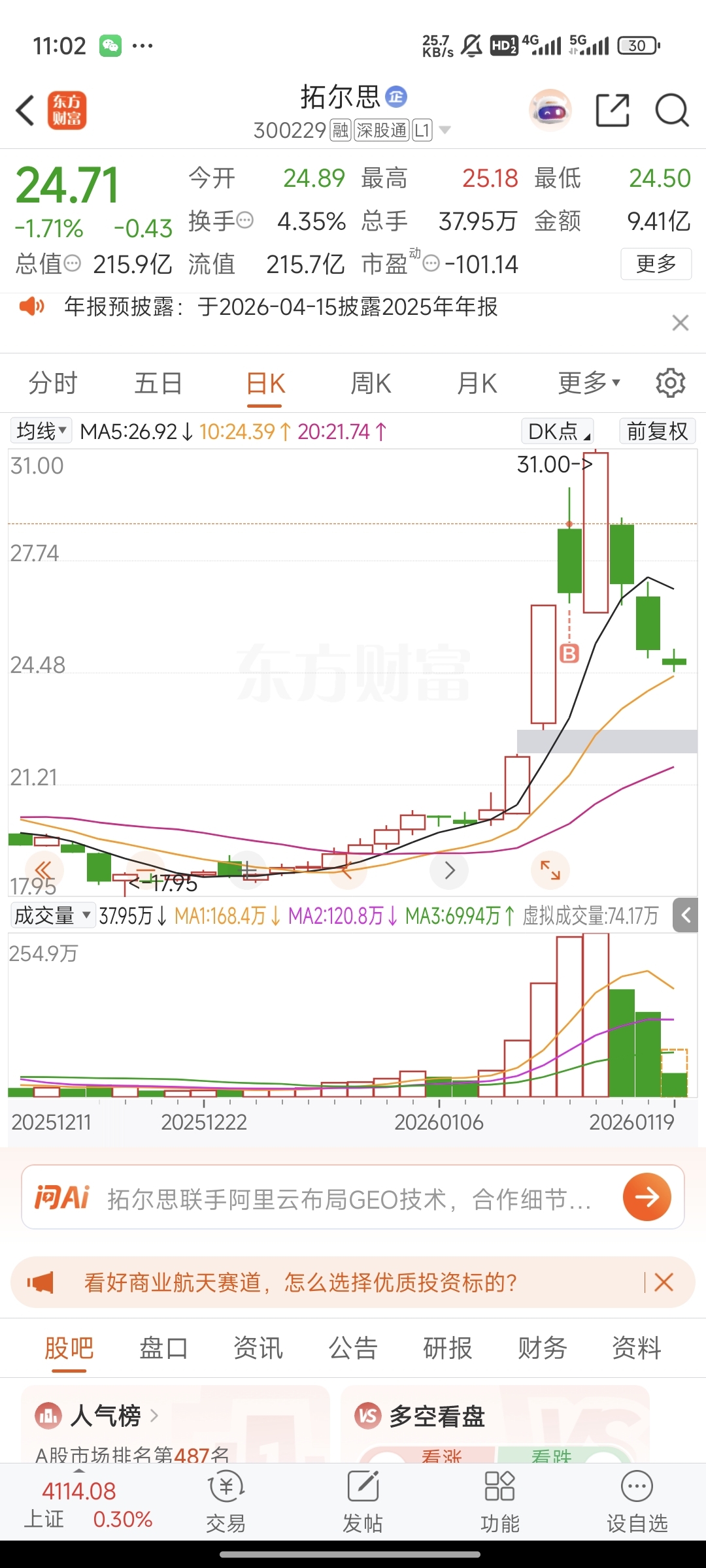 $拓尔思(SZ300229)$ 还撑一天,明天还是绿的,我就跑了