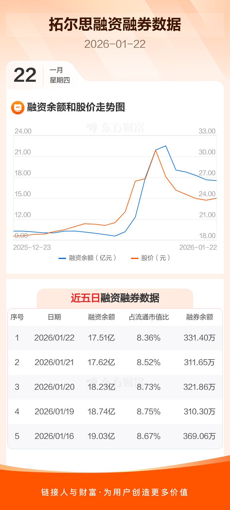交易所最新数据显示,拓尔思于2026年1月22日获融资买入1.00亿元,融资偿还1.11亿元,当日融资净偿还1105.64万元。目前,该股融资余额17.51亿,占流通市值比例为8.36%。