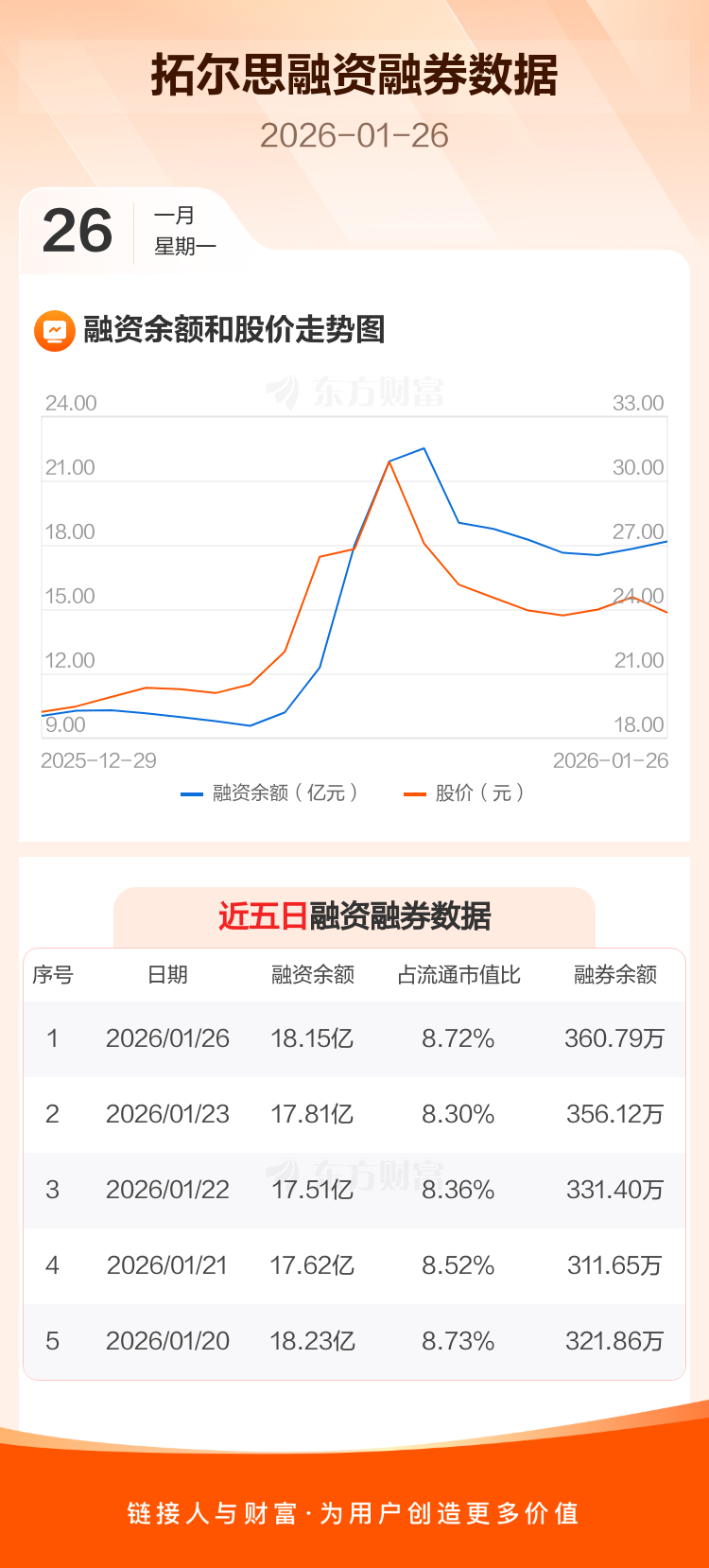 交易所最新数据显示,拓尔思于2026年1月26日获融资买入2.07亿元,融资偿还1.73亿元,当日融资净买入3429.79万元。目前,该股融资余额18.15亿,占流通市值比例为8.72%。