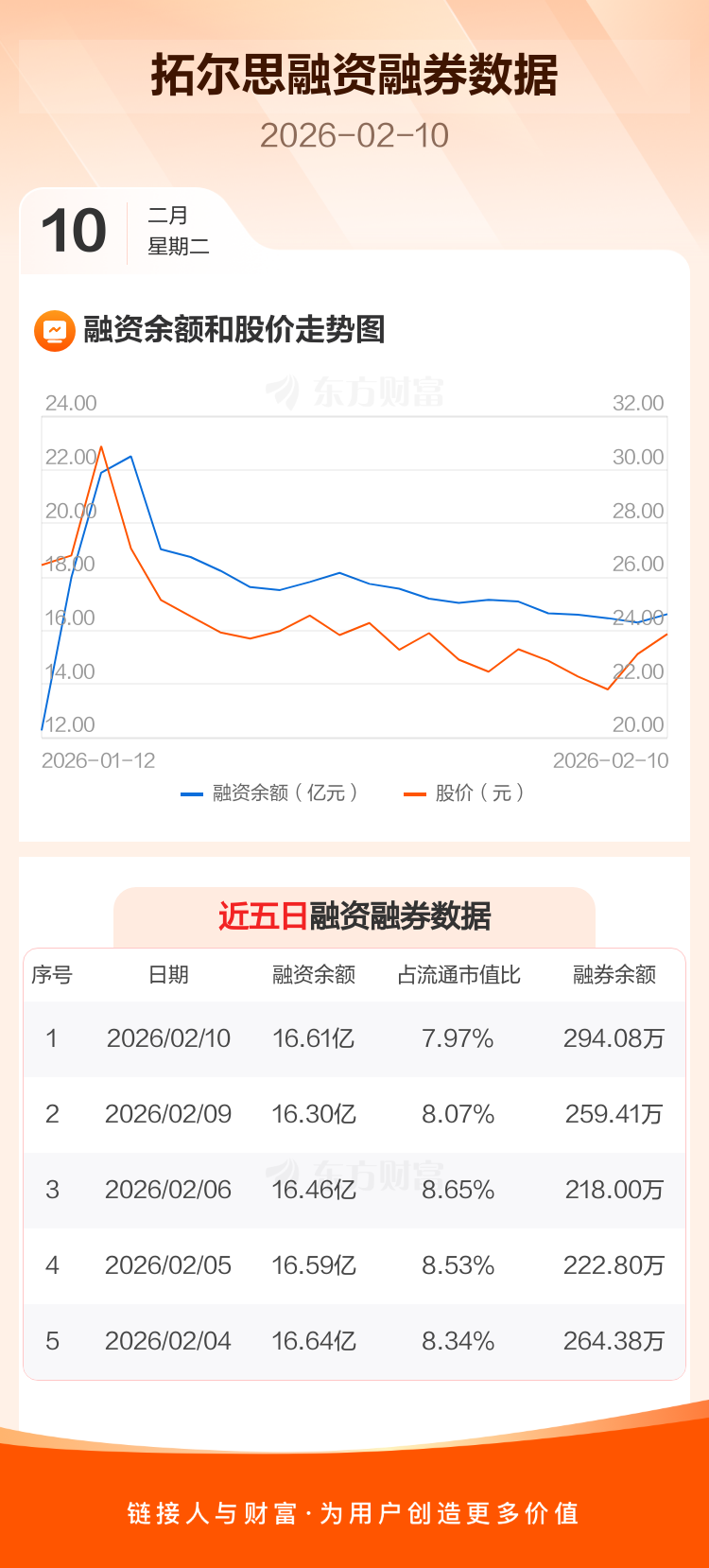 交易所最新数据显示,拓尔思于2026年2月10日获融资买入1.57亿元,融资偿还1.26亿元,当日融资净买入3083.98万元。目前,该股融资余额16.61亿,占流通市值比例为7.97%。