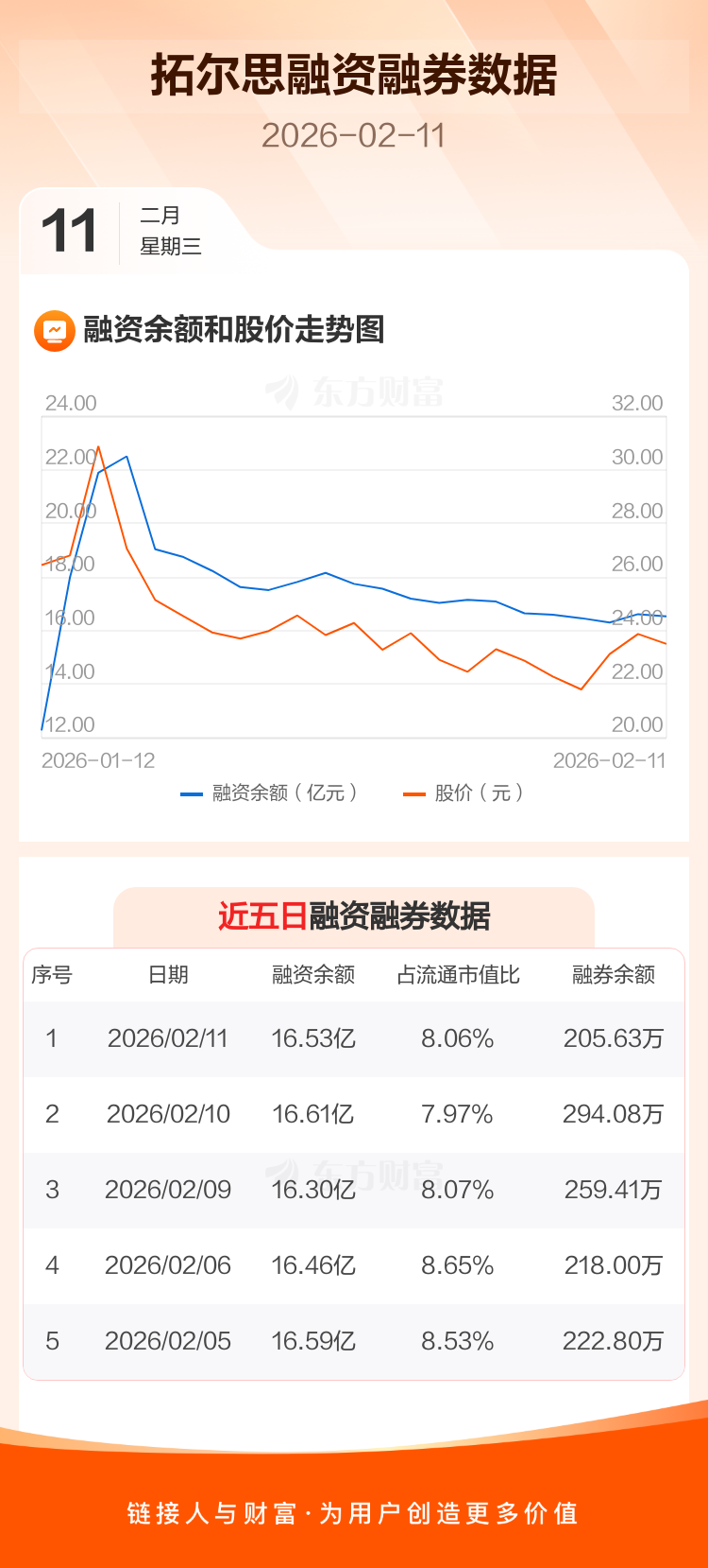 交易所最新数据显示,拓尔思于2026年2月11日获融资买入9194.73万元,融资偿还9938.89万元,当日融资净偿还744.17万元。目前,该股融资余额16.53亿,占流通市值比例为8.06%。