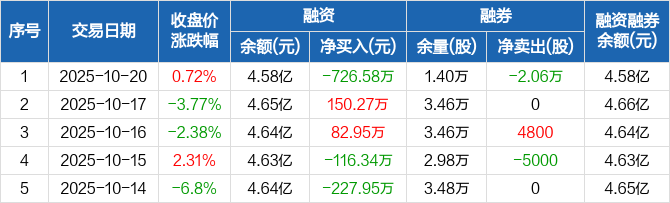 融资方面,当日融资买入654.56万元,融资偿还1381.14万元,融资净偿还726.58万元。融券方面,融券卖出300股,融券偿还2.09万股,融券余量1.4万股,融券余额23.42万元。融资融券余额合计4.58亿元。