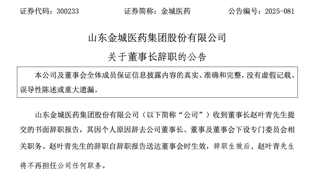 12月11日晚间,金城医药发布关于董事长辞职的公告。公司表示,赵叶青因个人原因辞去公司董事长、董事及董事会下设专门委员会相关职务。辞职生效后,赵叶青将不再担任公司任何职务。