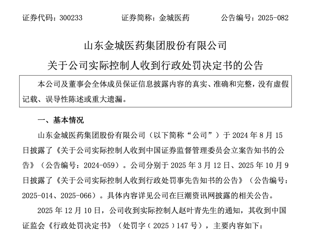 历时一年多的调查,金城医药实控人赵叶青带头操纵股价一案迎来结局。