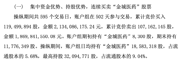 其中,操纵期间,账户组日均持有“金城医药”1858.33万股,占流通股本的5.68%,最高持股3209.48万股,占流通股本的9.04%。账户组共有214天在自己实际控制的账户之间交易金城医药股票,成交量占市场成交量比例超过10%的有76天,超过20%的有36天,超过30%的有13天,最高达到45.65%。