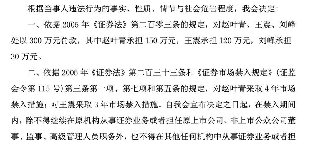 同时,中国证监会对赵叶青采取4年市场禁入措施;对王震采取3年市场禁入措施。在禁入期间内,除不得继续在原机构从事证券业务或者担任原上市公司、非上市公众公司董事、监事、高级管理人员职务外,也不得在其他任何机构中从事证券业务或者担任其他上市公司、非上市公众公司董事、监事、高级管理人员职务。