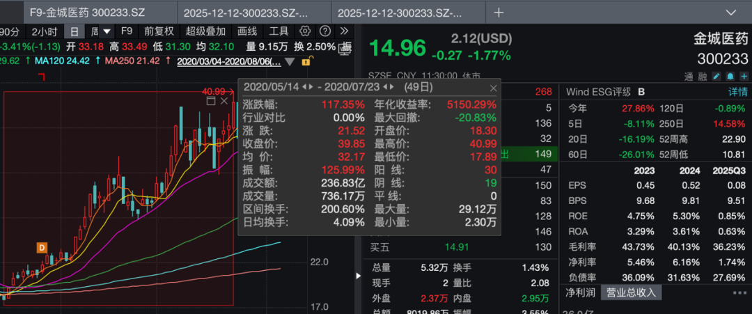 记者注意到,在这场操纵股价的闹剧结束的三个月后,即2020年5月,金城医药股价迎来一波抬升。2020年5月14日至2020年7月23日,该股股价区间涨跌幅达117.35%,已然翻倍。