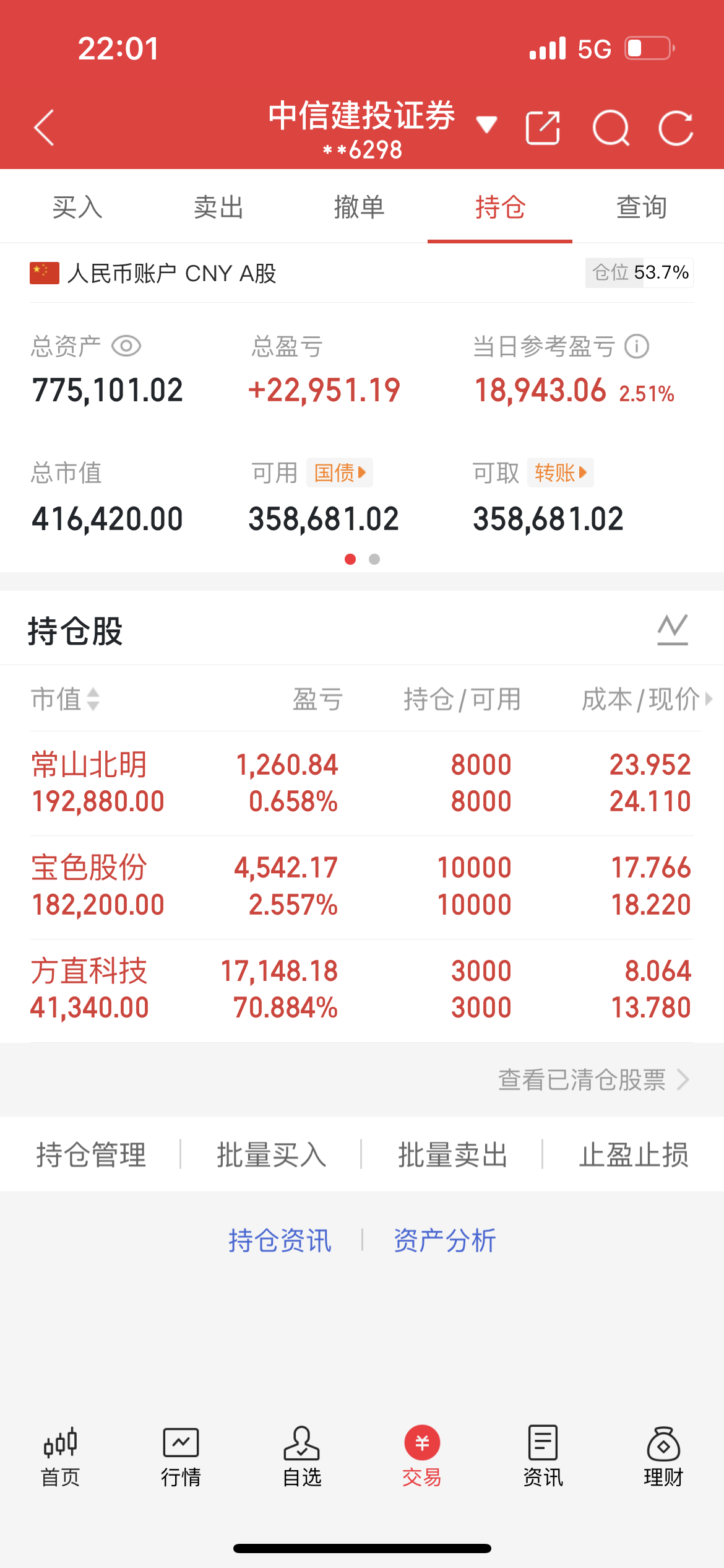 50万实盘,目前净值77.5万,这两天经过三联锻造和方直科技的拉升,净值创了新高,操作上目前还是以高抛低吸为原则,仓位控制在半仓,今天清了方直之后原来的仓位调到了常山北明,其他不变。。。$方直科技(SZ300235)$ $宝色股份(SZ300402)$ $常山北明(SZ000158)$